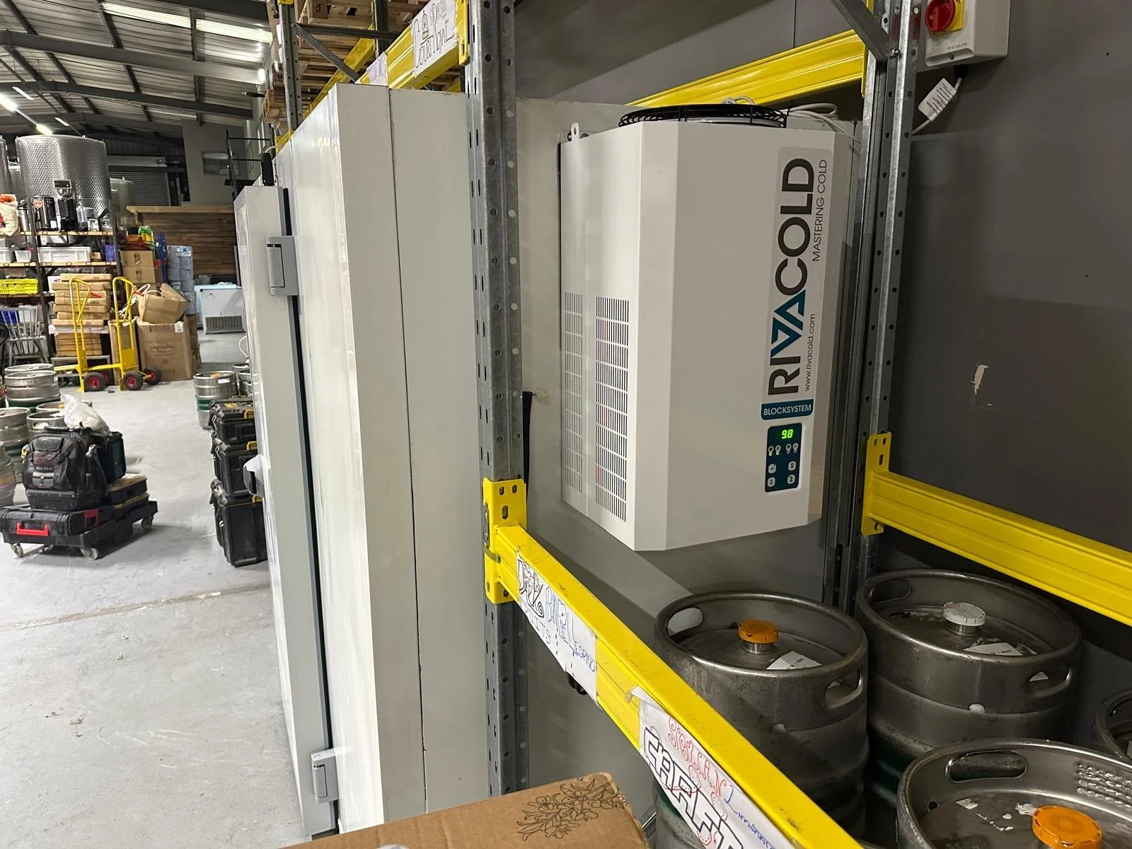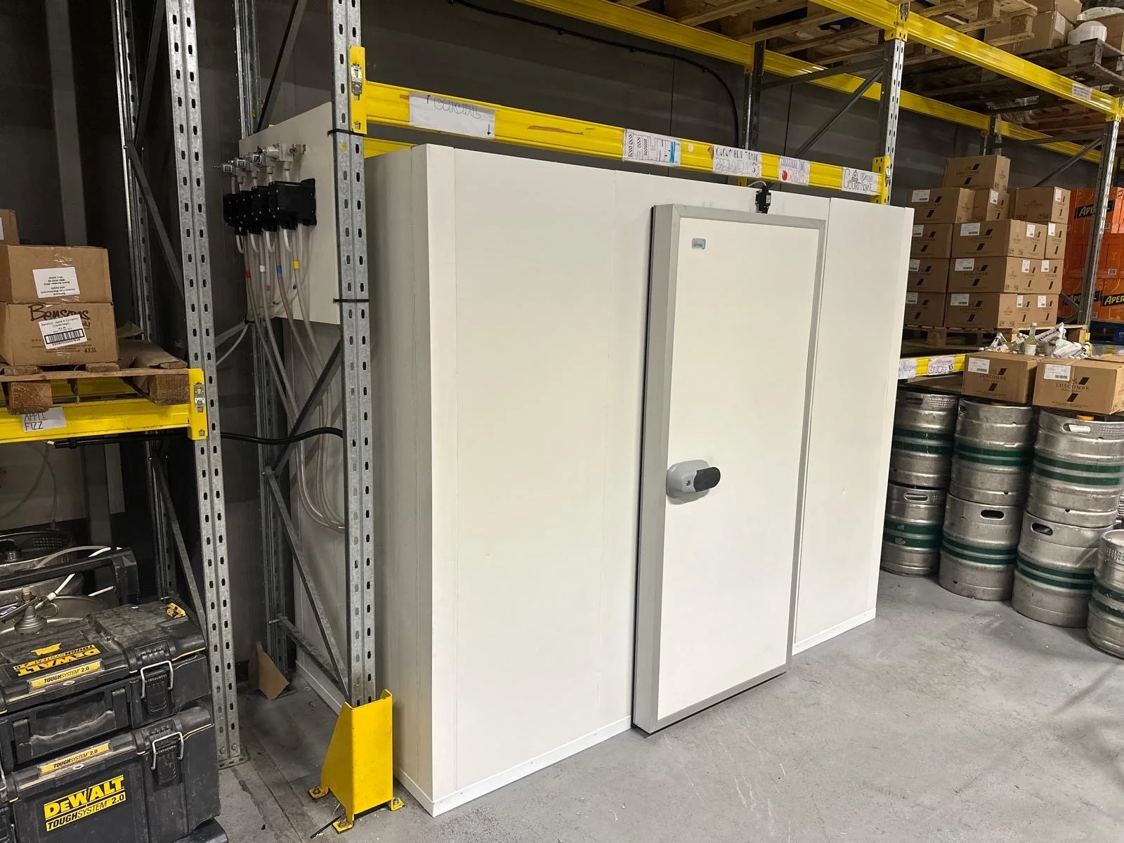 B-grade beer chiller room with floor and B-grade integral chiller unit designed to fit in between pallet racking system at Dunkertons Cider in Cheltenham to store Stroud Brewery beers.