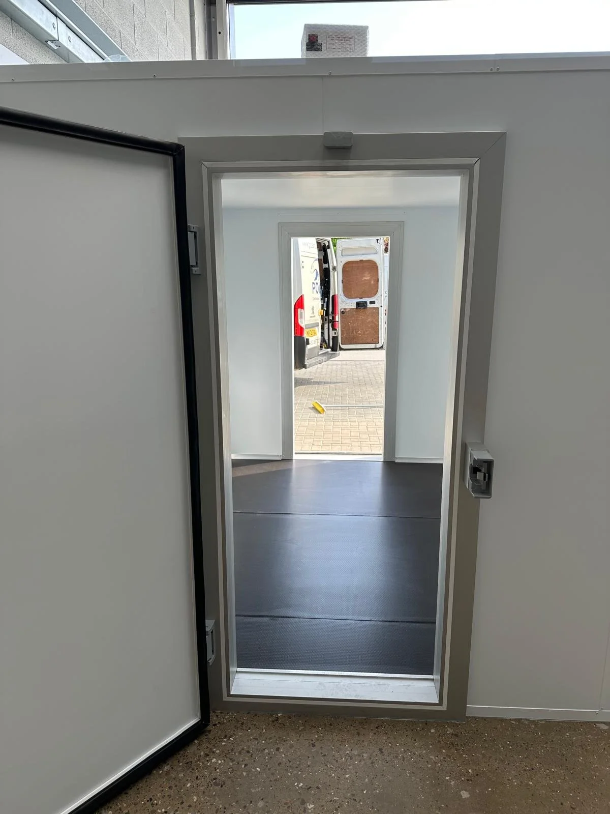 Two-door ice cream freezer in the North Cotswolds. Bespoke freezer room with floor and two freezer doors complete with heated frames and low voltage transformers.